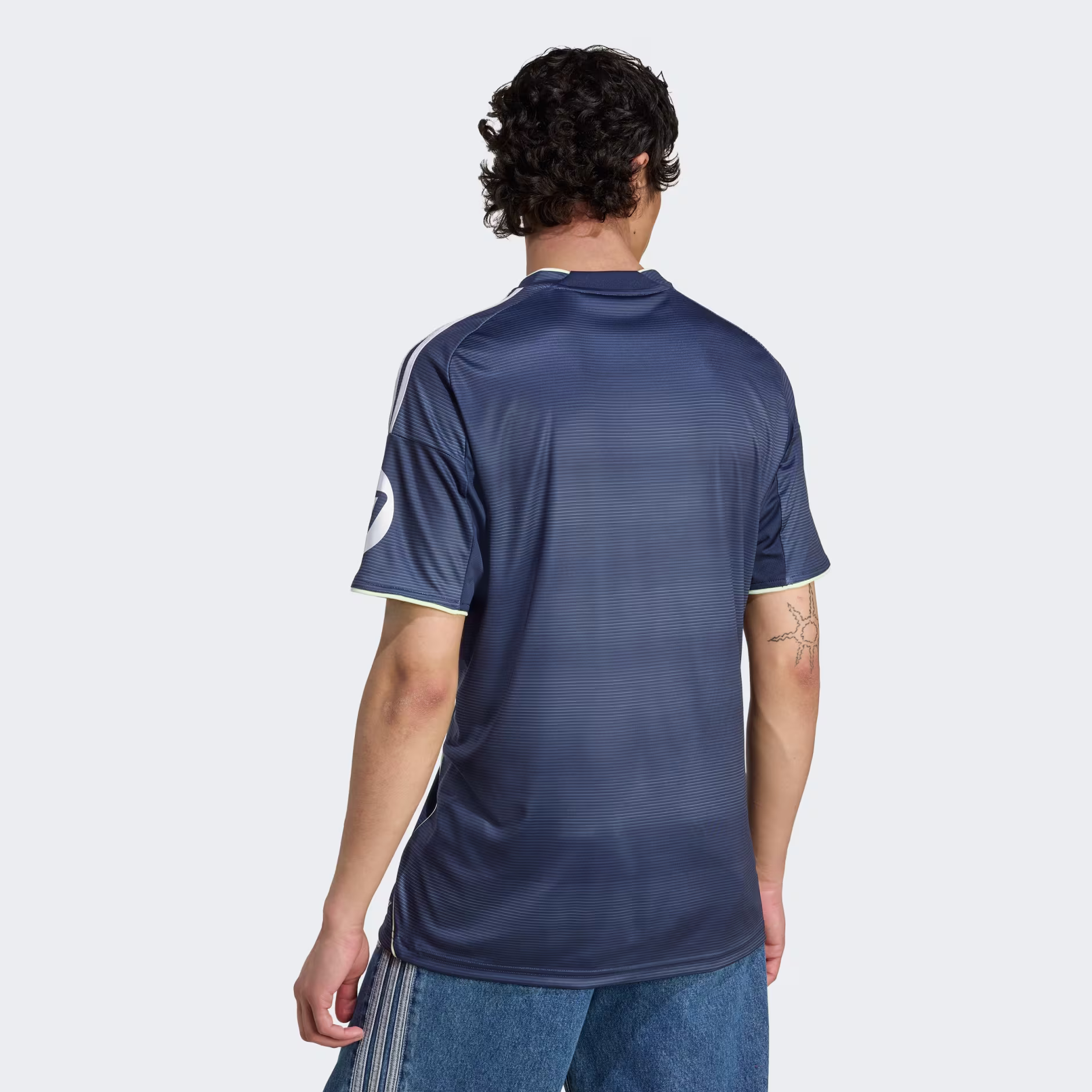 As Real Madrid's world-famous stadium enters a brand-new era, this adidas away football jersey pays tribute to magical nights at the Santiago Bernabéu. Its moiré effect print and silver metallic details combine to mimic the gleaming facade of the renovated arena. Moisture-managing AEROREADY ensures fans feel home comforts when they're on the road with their team.