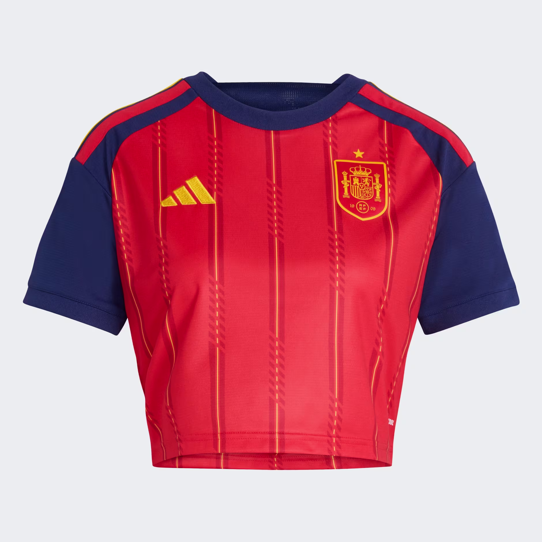 When it comes to football, heritage and innovation go hand in hand. The Spain 26 Home Cropped Jersey celebrates the elegance of Spanish football, drawing inspiration from the vibrancy of the Spanish flag. Designed with the game in mind, the jersey incorporates Climacool technology to wick and disperse sweat for a cool, dry and distraction-free performance, allowing you to feel focused and ready even during intense matches. The regular fit allows for freedom of movement and a feeling of easy comfort, while the crew neck and iconic 3-Stripes add a touch of classic heritage to a standout design. Embrace the spirit of rebellious optimism in a jersey that delivers performance-driven technology while paying homage to Spain's rich cultural legacy. With adidas, it’s more than just clothing. It’s a lifestyle.